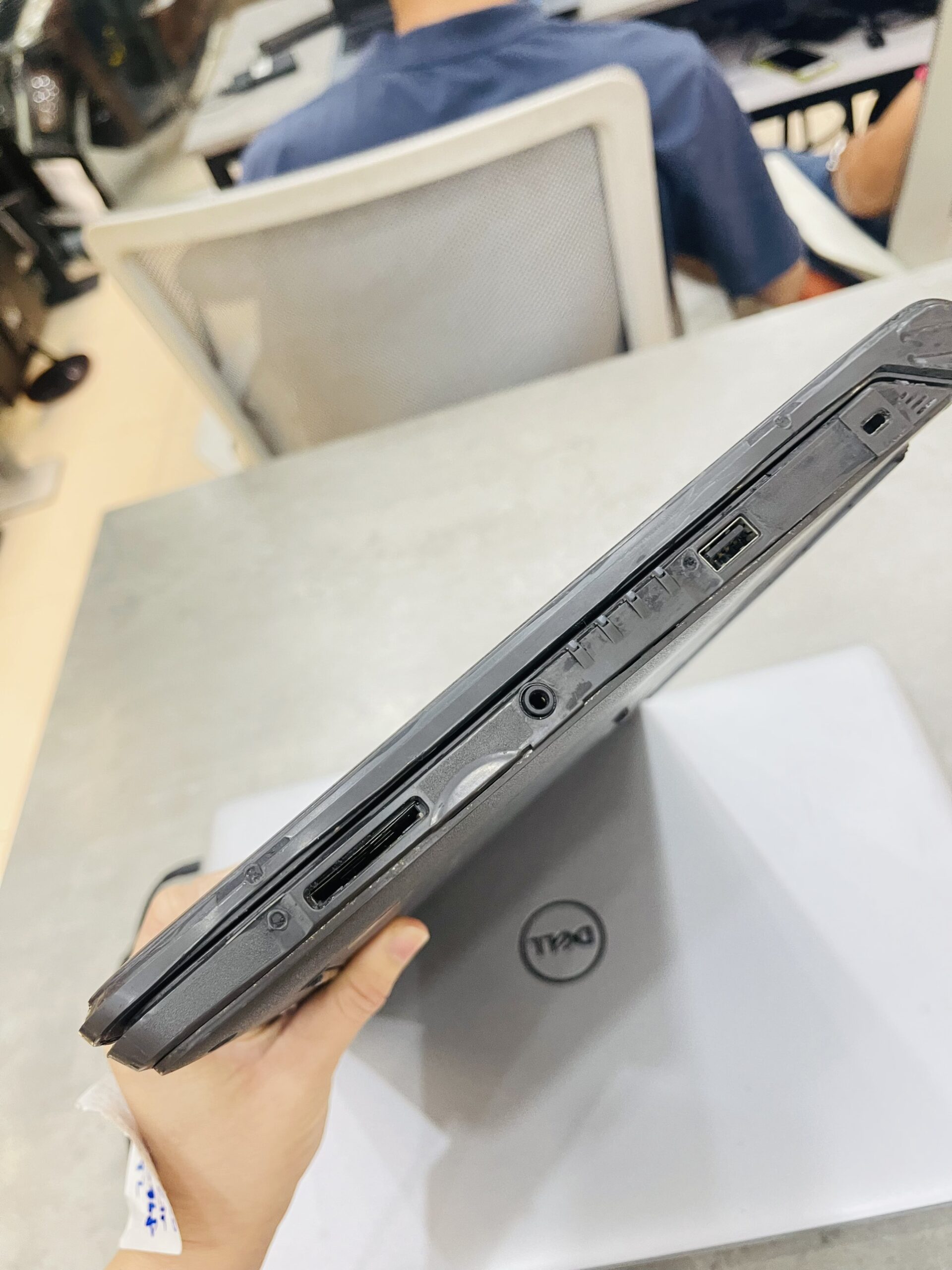 Bề mặt nắp được bao bọc 1 lớp vỏ nhám có độ bền cao, nên bạn có mang đi lại nhiều mà không lo hỏng hóc do va chạm nhẹ. Màu đen được lấy làm màu chủ đạo cho Dell Latitude 3350 tạo nên sự mạnh mẽ và lịch lãm của một người trưởng thành. Logo Dell vẫn giữ nguyên thiết kế màu đen bóng được in chìm vào phần nắp, không được mạ bạc hay khắc 3D như các dòng Dell Latitude khác. Tuy không nổi bật nhưng các dòng khác nhưng Dell Latitude 3350 vẫn toát lên vẻ sang trọng, huyền bí và chắc chắn hơn.